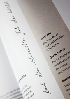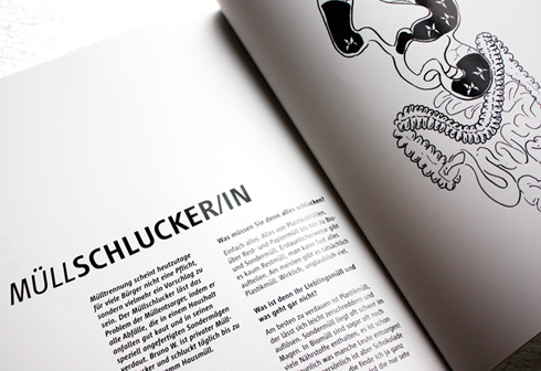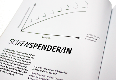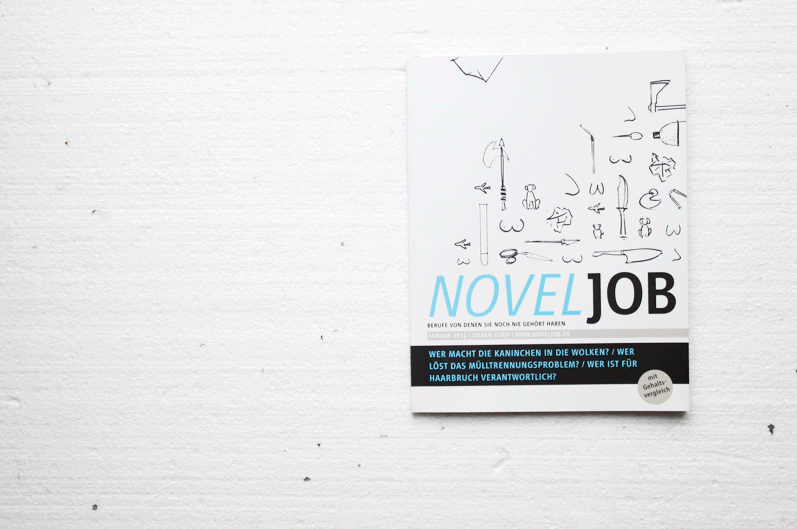 NOVELJOB is a magazine about imaginary jobs, such as Wolkenkratzer (sky scraper), Büstenhalter (breast holder/bra) and Müllschlucker (garbage disposer/eater). It includes job descriptions, interviews and portraits of people and their jobs with additional visual information, as the one seen above.
