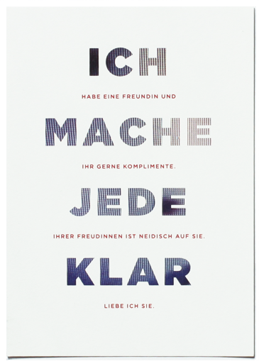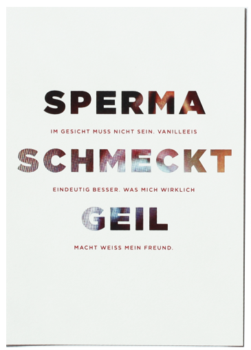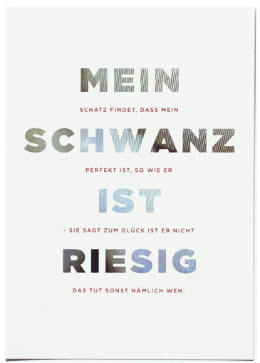 At first glance the postcards show what one could falsely learn from pornography and perceive as reality. But if you read between the lines you can see the truth that might be hidden behind that facade. ("My dick is huge" vs. "My dick is just right. My girlfriend says that it would hurt if it were huge.")